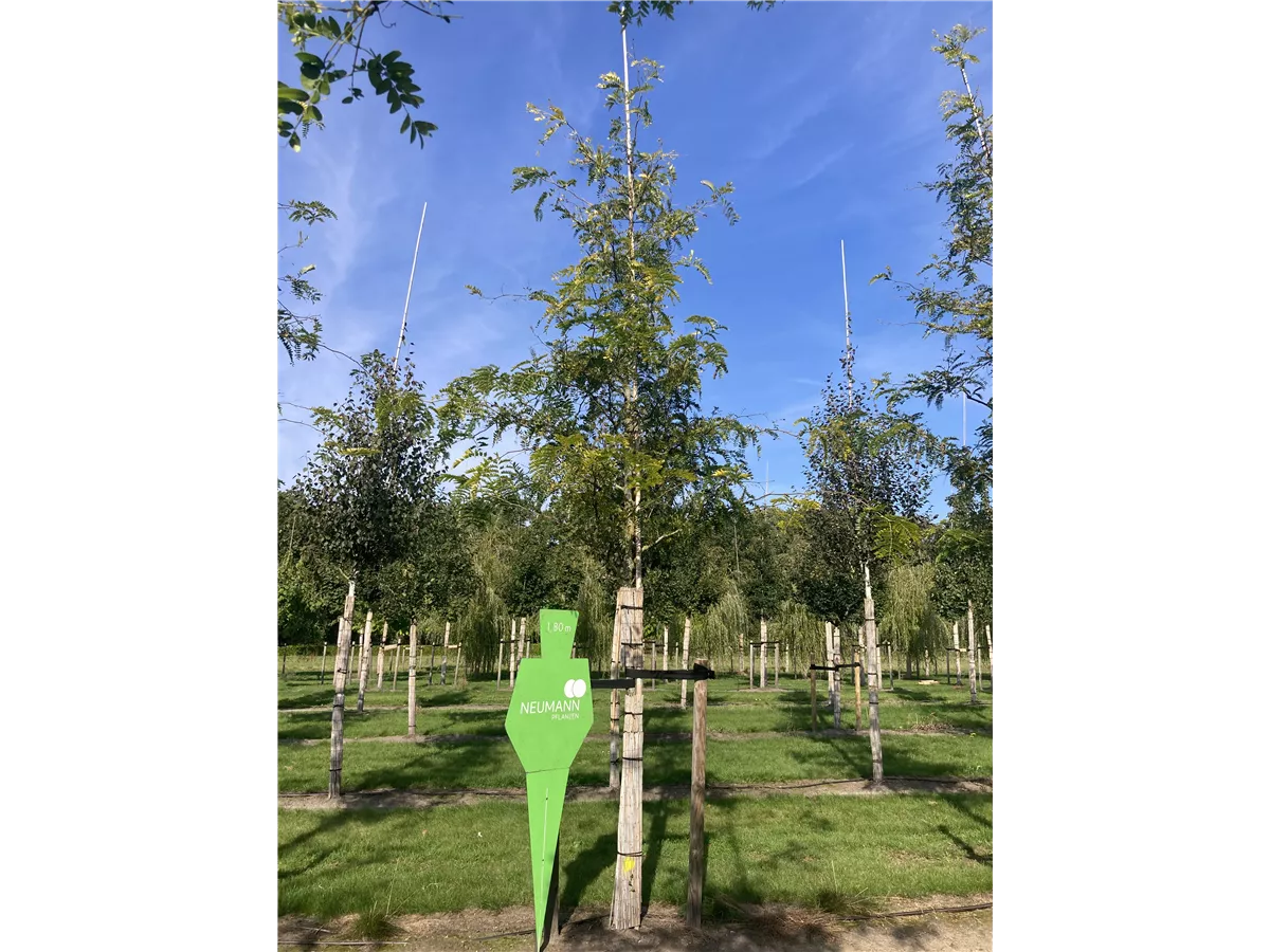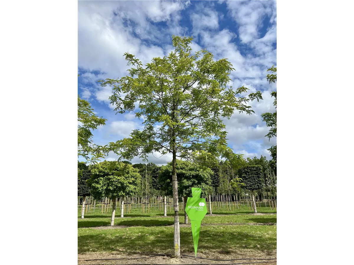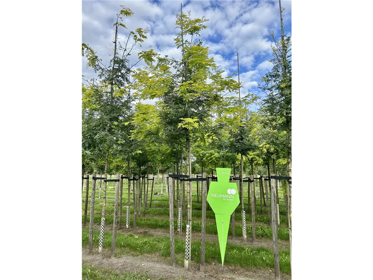 Lederhülsenbaum 'Sunburst' ist ein aufrecht und locker wachsender Kleinbaum mit lichtdurchlässiger, lockerer Krone. Er erreicht gewöhnlich eine Höhe von 8 - 12 m und wird ca. 6 - 7 m breit. Langsam wachsend. In der Regel wächst er 20 - 25 cm pro Jahr.