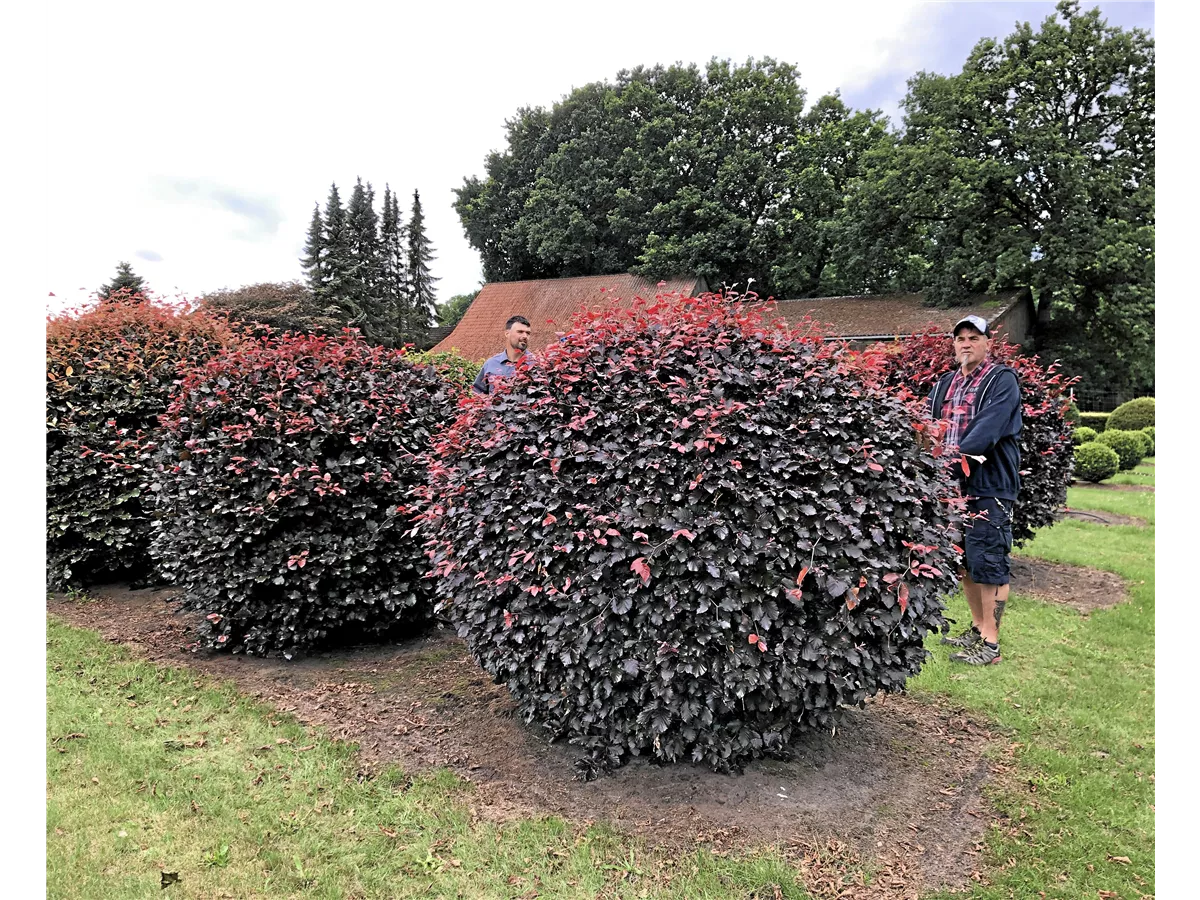 Die Blutbuche (Fagus sylvatica) ist ein aufrechter, breiter, sommergrüner Großbaum mit dekorativen, eiförmigen, schwarz-roten Blättern. Der dunkelrote Austrieb ist ebenso ein interessanter Anblick. Zudem trägt sie ab September braune Früchte hervor. An einem sonnigen bis halbschattigen Standort mit durchlässigem, humosem, nährstoffreichem Boden erreicht sie gewöhnlich eine Höhe von ca. 30 m und wird ca. 30 m breit.