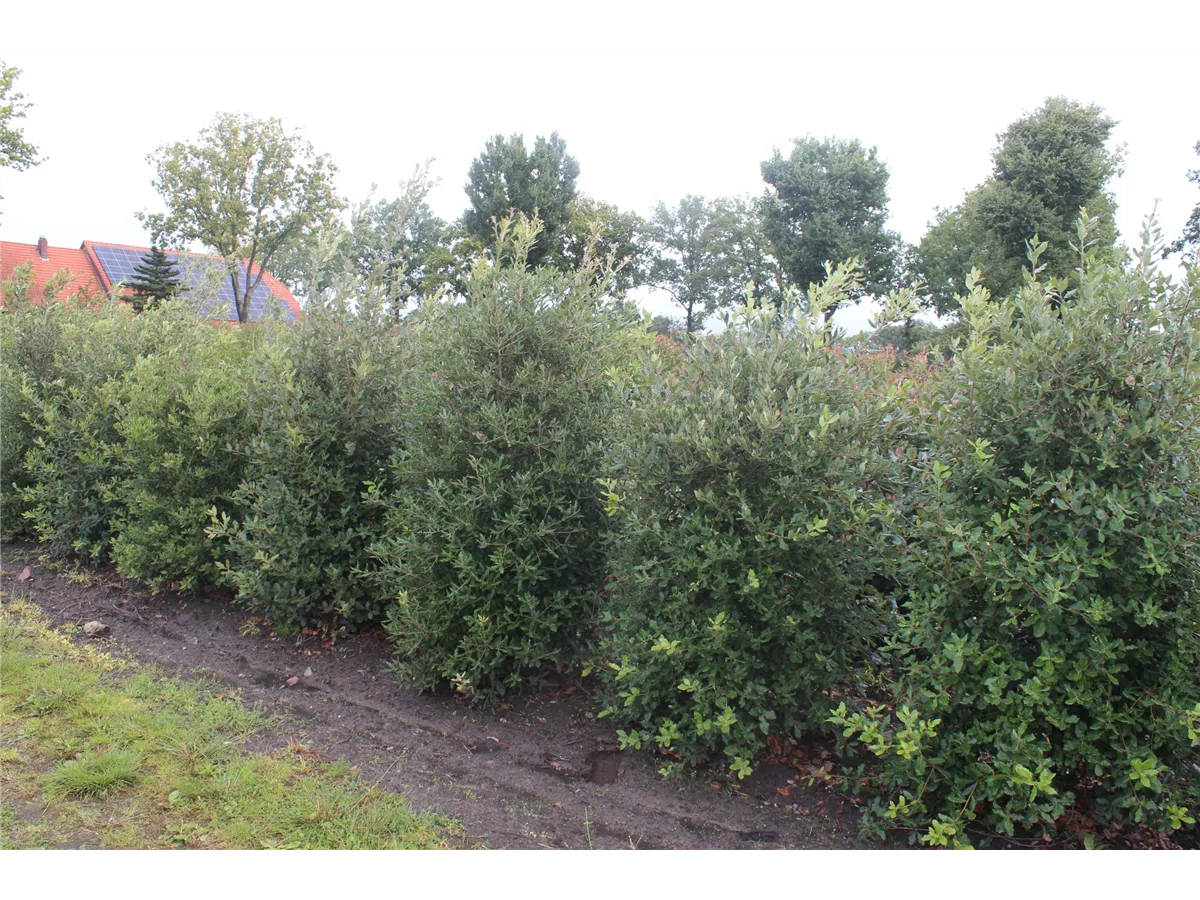 Die Stein-Eiche (Quercus ilex) ist ein kugelförmiger Kleinbaum mit dekorativen, grau-grünen, ovalen Früchten. Diesen voraus bringt sie von April bis Mai cremeweiße, in Kätzchen angeordnete Blüten hervor. Zudem trägt die Stein-Eiche, ledrige, eiförmige, dunkelgrüne Blätter. An einem sonnigen, windgeschützten Standort mit durchlässigem, nährstoffreichem Boden erreicht sie gewöhnlich eine Höhe von ca. 12 m und wird ca. 9 m breit.
