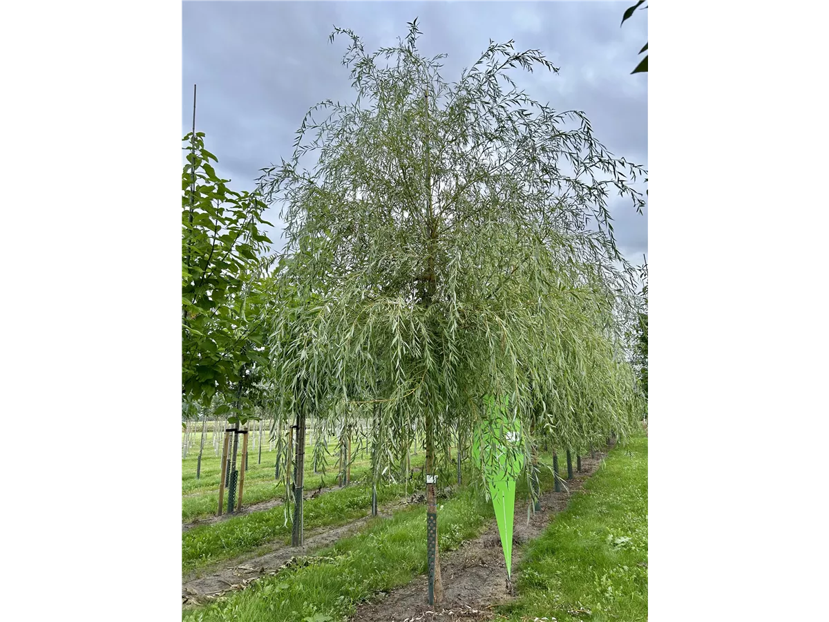 Die Trauerweide 'Tristis' (Salix alba) ist ein hängender, malerischer Baum, der gelbe, in Kätzchen angeordnete Blüten hervorbringt. Sie erscheinen von April bis Mai. Aus diesen gehen weiße Früchte hervor. Zudem trägt die Trauerweide 'Tristis', behaarte, lanzettliche, mittelgrüne Blätter. Der gelb-grüne Austrieb ist ebenso ein interessanter Anblick. Ihre Rinde ist grau, tiefrissig. An einem sonnigen bis halbschattigen Standort mit kalkhaltigem, nährstoffreichem Boden erreicht sie gewöhnlich eine Höhe von ca. 20 m und wird ca. 20 m breit.