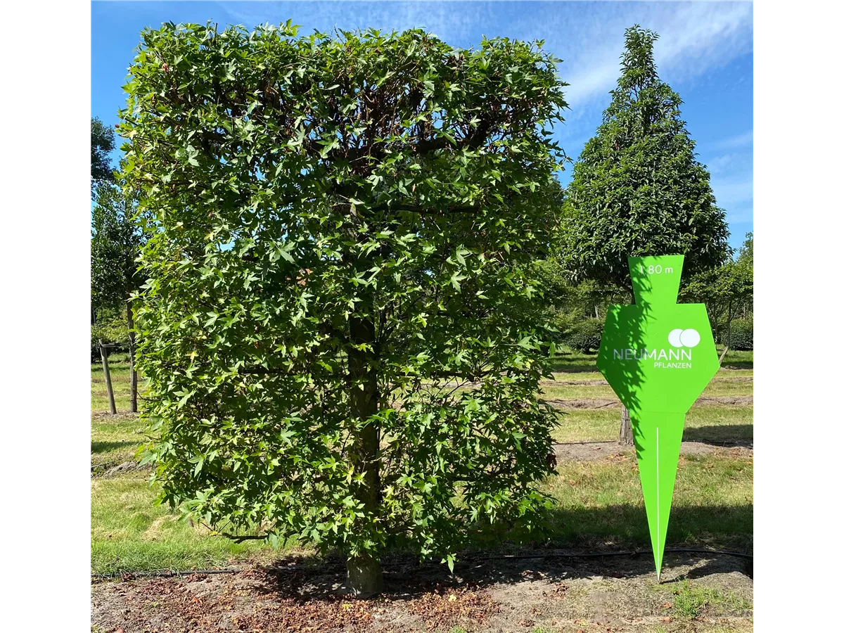 Der Amerikanische Amberbaum (Liquidambar styraciflua) ist ein kegelförmiger, aufrechter Baum mit dekorativen, braunen, runden Früchten, die sehr lange haften. Diesen voraus bringt er im Mai grüngelbe, in Ähren angeordnete Blüten hervor. Zudem trägt der Amerikanische Amberbaum, gefingerte, mittelgrüne Blätter. An einem sonnigen Standort mit kalkfreiem, nährstoffreichem, schwachsaurem Boden erreicht er gewöhnlich eine Höhe von ca. 30 m und wird ca. 12 m breit.