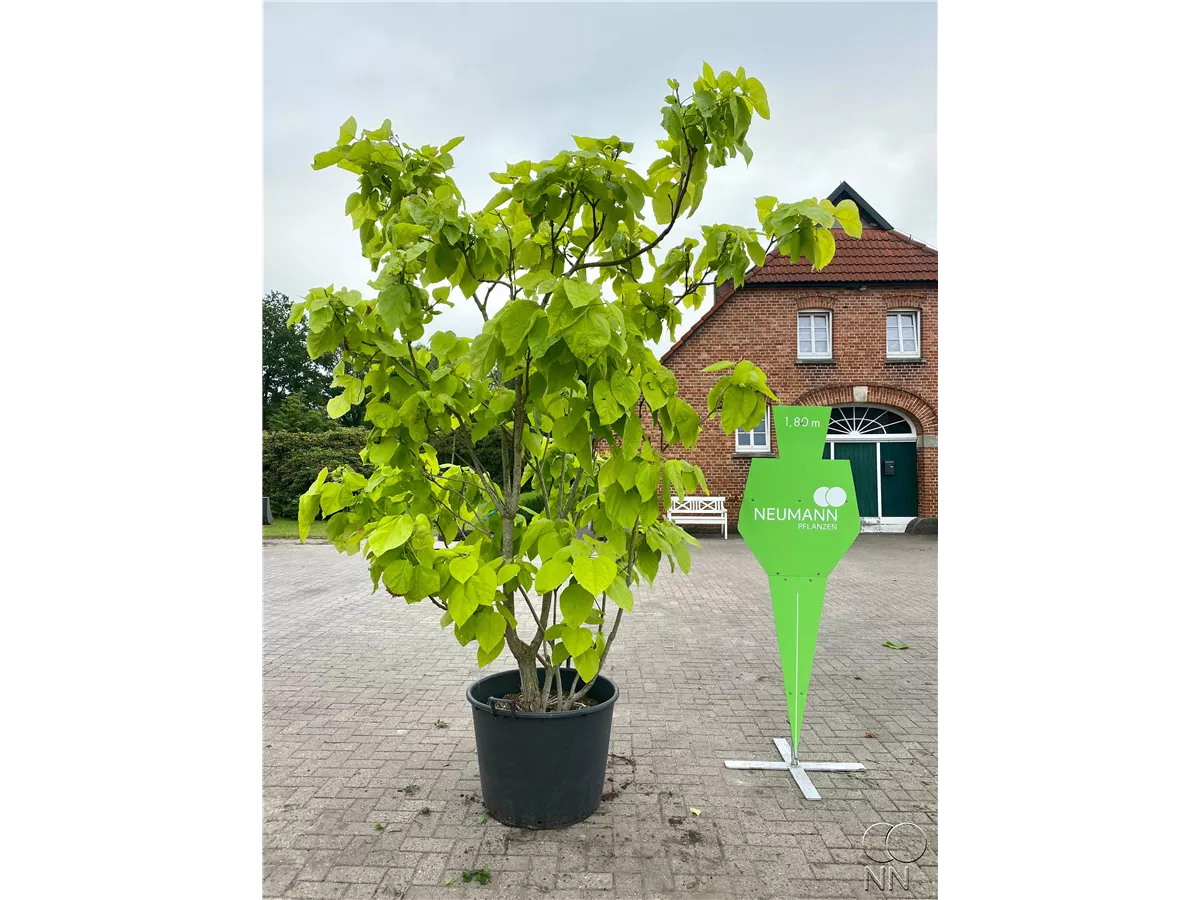 Die sommergrünen Blätter des Trompetenbaums sind mittelgrün, herzförmig, gegenständig. Diese sind etwa 10 - 20 cm groß. Trompetenbaum zeigt sich leuchtend gelb im Herbst.