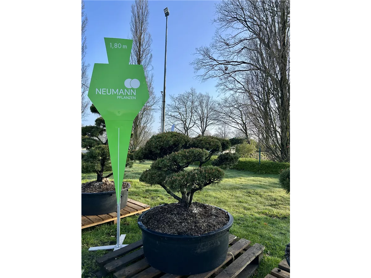 Die Kugel-Kiefer 'Mops' (Pinus mugo) ist ein Kleinstrauch, welcher dicht, kugelförmig wächst und gewöhnlich eine Höhe von ca. 2 m und eine Breite von ca. 1 m erreicht. Ihre nadelförmigen Blätter haben eine mittelgrüne Färbung. Dekorative braun-gelbe Zapfen zieren Pinus mugo 'Mops' ab Oktober. Dieses Gehölz ist gut frostverträglich. Sie bevorzugt einen sonnigen bis halbschattigen Standort. An den Boden stellt die Kugel-Kiefer 'Mops' keine besonderen Ansprüche.