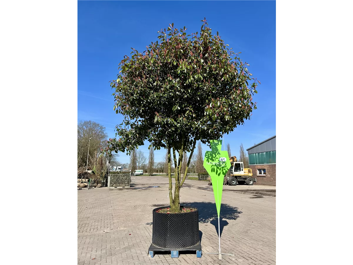 Die Glanzmispel 'Red Robin' (Photinia fraseri) ist ein strauchartiger, aufrechter, lockerer, immergrüner Strauch mit dekorativen, glänzenden, lanzettlichen, dunkelgrünen Blättern. Der rote Austrieb ist ebenso ein interessanter Anblick. Zudem trägt sie von Mai bis Juni weiße Blüten. Aus diesen gehen ab August rote, runde Früchte hervor. An einem sonnigen bis halbschattigen, windgeschützten Standort mit durchlässigem, humosem Boden erreicht sie gewöhnlich eine Höhe von ca. 3 m und wird ca. 3 m breit.