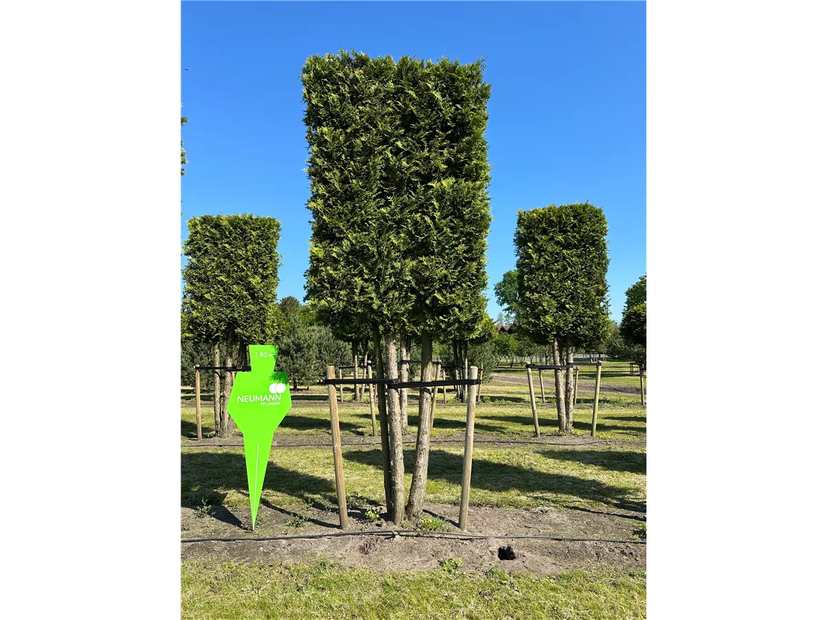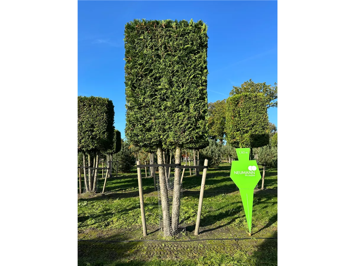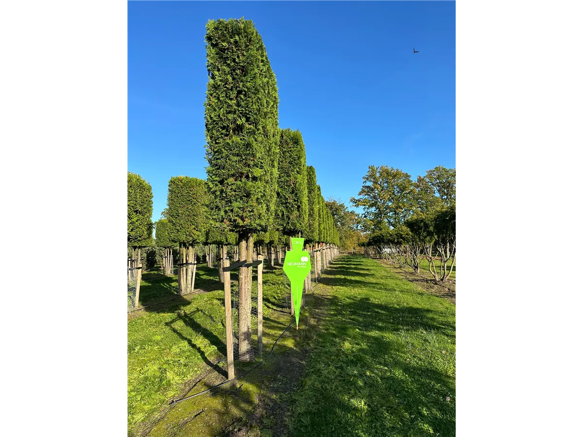 Der Lebensbaum 'Brabant' (Thuja occidentalis) ist ein Baum, welcher kegelförmig, aufrecht wächst und gewöhnlich eine Höhe von ca. 4 m und eine Breite von ca. 1,2 m erreicht. Seine schuppenförmigen Blätter haben eine mittelgrüne Färbung. Dekorative braune Zapfen zieren Thuja occidentalis 'Brabant' ab Oktober. Dieses Gehölz ist gut frostverträglich.Er bevorzugt kalkhaltigen, nährstoffreichen, sandigen, lehmigen Boden in sonniger bis halbschattiger Lage.