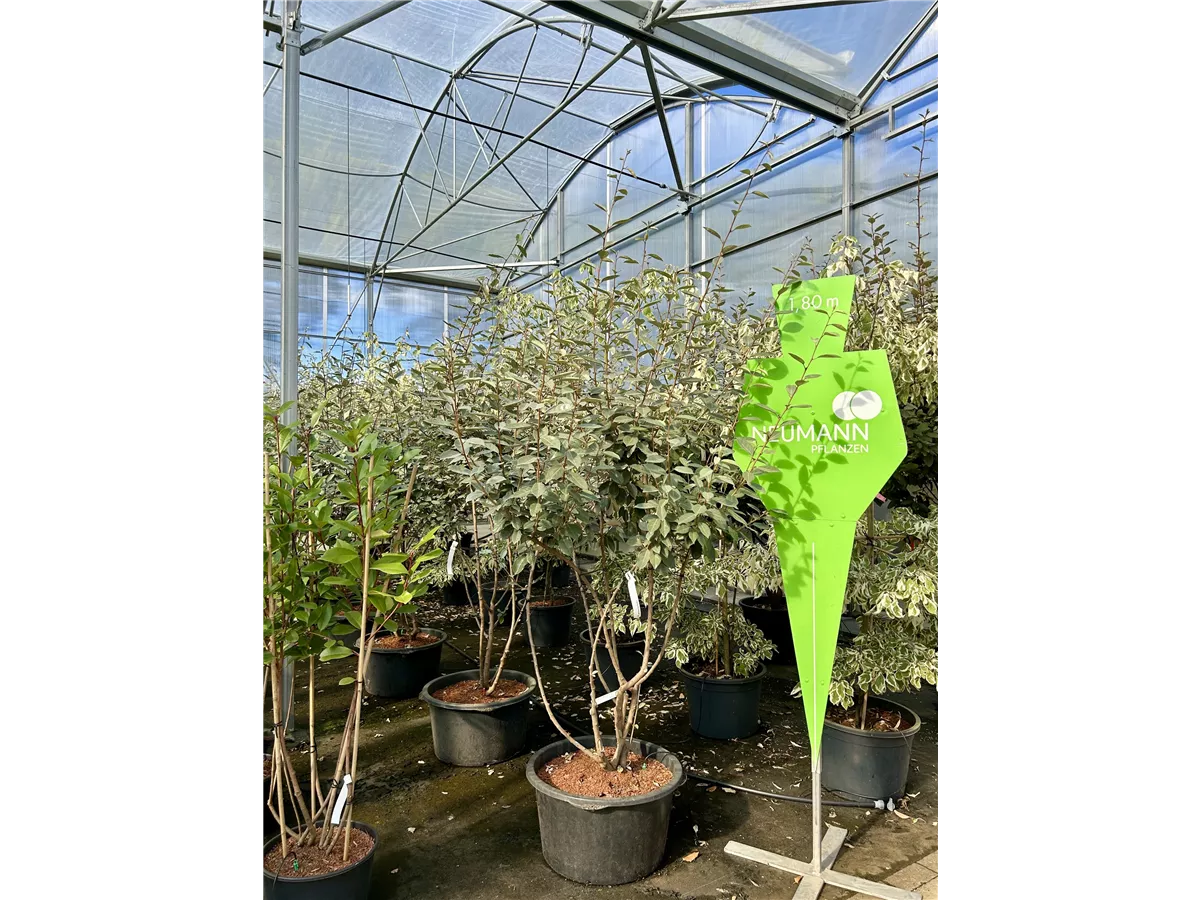 Die Wintergrüne Ölweide (Elaeagnus x ebbingei) ist ein aufrechter, wintergrüner Strauch mit dekorativen, glänzenden, ledrigen, lanzettlichen, dunkelgrünen Blättern. Zudem trägt sie von September bis November cremeweiße, röhrenförmige Blüten. An einem halbschattigen, windgeschützten Standort mit durchlässigem, schwachsaurem Boden erreicht sie gewöhnlich eine Höhe von ca. 3 m und wird ca. 3 m breit.