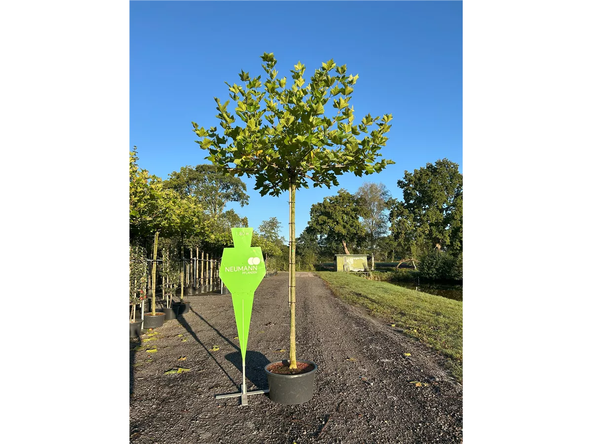 Die Ahornblättrige Platane (Platanus x hispanica) ist ein ausladender, breiter Großbaum mit dekorativen, braun-gelben, runden Früchten, die sehr lange haften. Zudem trägt die Ahornblättrige Platane, ledrige, dreieckige, mittelgrüne Blätter. An einem sonnigen bis halbschattigen Standort mit durchlässigem, kalkhaltigem, lehmigem Boden erreicht sie gewöhnlich eine Höhe von ca. 30 m und wird ca. 25 m breit.