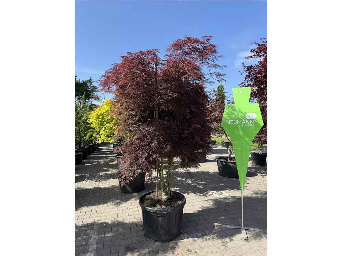 Der Fächerahorn 'Inaba-shidare' (Acer palmatum) ist ein gedrungener, überhängender, sommergrüner Strauch mit dekorativen, tief geschlitzten, dunkelroten Blättern. Zudem trägt er im Mai purpurrote, in Trauben angeordnete Blüten. Aus diesen gehen rote Flügelfrüchte hervor. An einem sonnigen bis halbschattigen, windgeschützten Standort mit durchlässigem, humosem Boden erreicht er gewöhnlich eine Höhe von ca. 2,5 m und wird ca. 3 m breit.