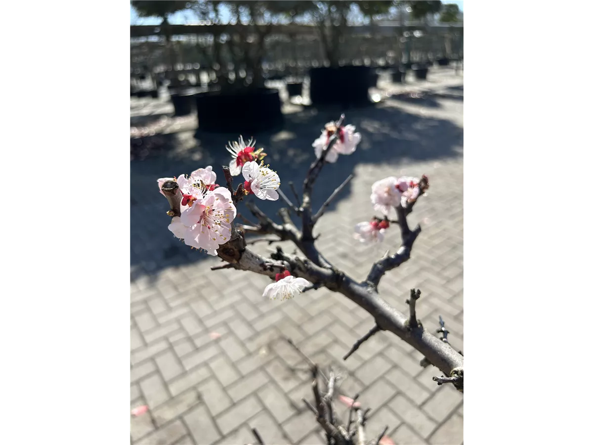 Prunus armeniaca bildet becherförmige, hellrosafarbene Blüten ab März. Diese verströmen einen angenehmen Duft und werden etwa 2,5 - 3 cm groß.